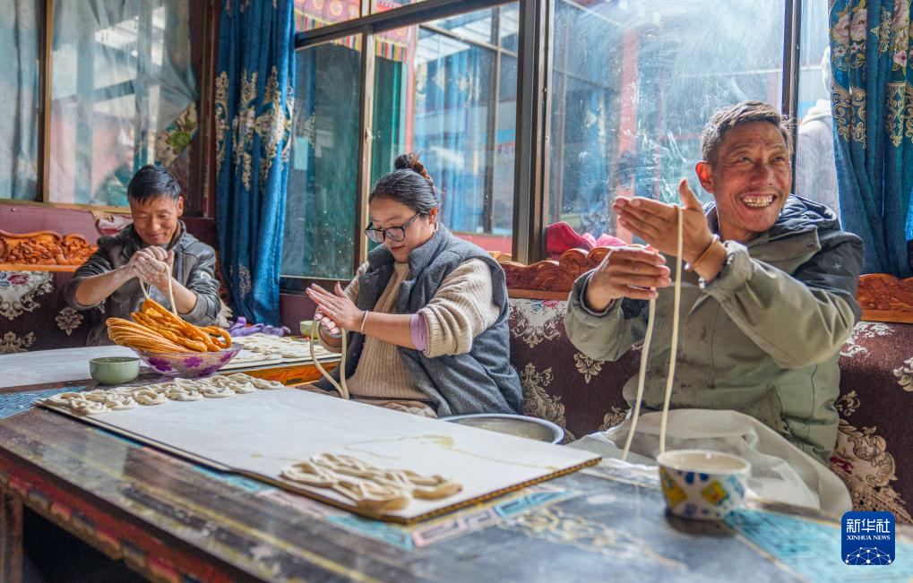 2月5日,玉麥鄉(xiāng)村民在家里做卡塞(一種傳統(tǒng)油炸面食),迎接即將到來的藏歷新年。新華社記者 丁增尼達 攝