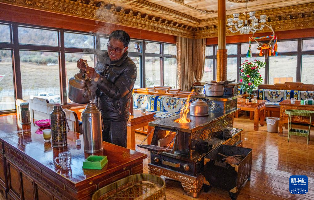 2月5日,玉麥鄉(xiāng)村民旺慶在自家經(jīng)營的民宿里灌開水。新華社記者 丁增尼達 攝