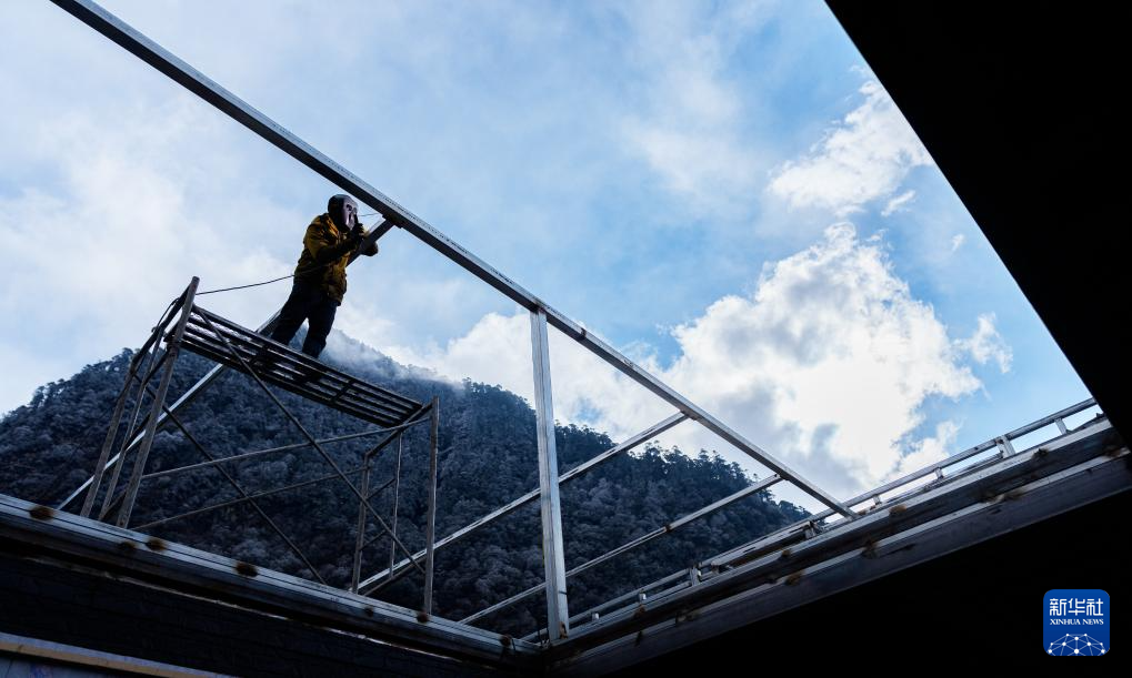 2月5日,玉麥鄉(xiāng)村民在焊接民居的天花板鋼架。新華社記者 丁增尼達 攝