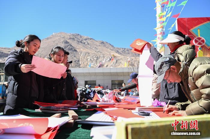 圖為書法家免費(fèi)給村民寫對(duì)聯(lián)。中新社記者 貢嘎來松 攝