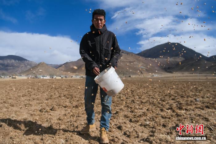 2月8日,西藏拉薩林周縣黑頸鶴巡護員桑珠在田間播撒小麥,為黑頸鶴補充食物。中新社記者 江飛波 攝