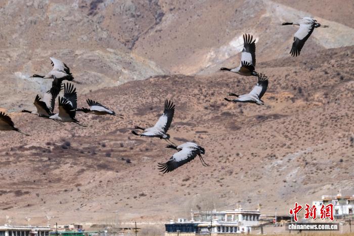 2月8日,一群越冬黑頸鶴飛過拉薩市林周縣春堆鄉(xiāng)卡東村上空。中新社記者 江飛波 攝