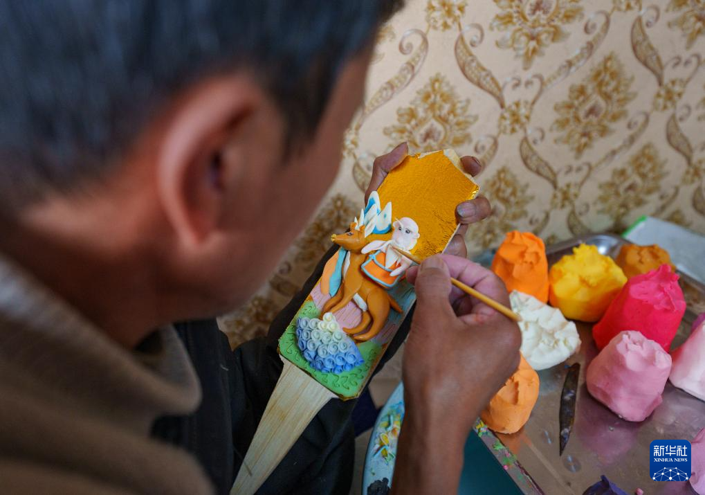 2月12日,在拉薩市林廓東路,來(lái)自西藏日喀則市仁布縣普松鄉(xiāng)的手工藝人羅布在制作酥油花。新華社記者 丁增尼達(dá) 攝
