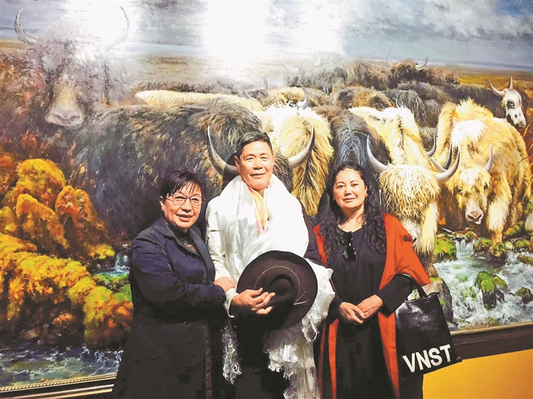 圖為唐瑟達(dá)娃(右一)和友人在畫展上合影。記者 盧文靜 攝