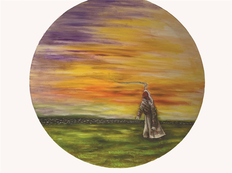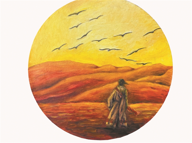 這種融合,在她的作品中綻放出獨(dú)特的光彩。她的作品《在路上》在第二屆“和美西藏”美術(shù)作品大賽上獲優(yōu)秀作品獎(jiǎng)。這幅作品描繪了曲水縣俊巴村漁民勞作的日常詩(shī)篇,畫面上,夕陽(yáng)將雅魯藏布江染成金紅色,一位漁民背著輕巧的牛皮船,踏著蜿蜒的村道歸家。他的身軀因負(fù)重而微微前傾,腳步卻輕快有力,嘴里似乎還哼唱著漁歌,整個(gè)畫面流淌著收獲的滿足與歸家的愉悅。