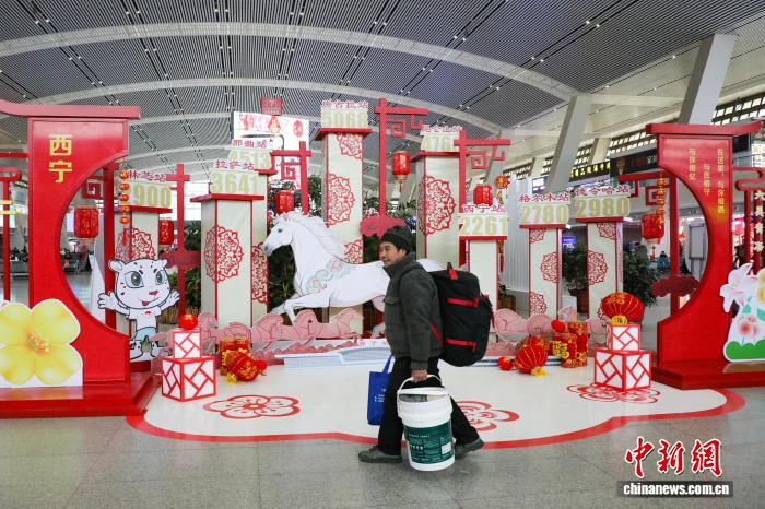 2月2日,2026年中國(guó)春運(yùn)首日,旅客從西寧火車站裝扮的馬年氛圍裝飾區(qū)前走過(guò)。馬銘言 攝