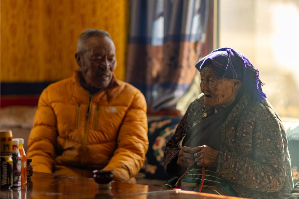 貢覺曲珍(中)和家人在家中聊天(3月6日攝)。