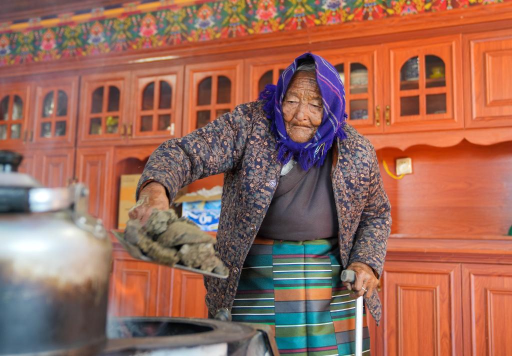 貢覺曲珍在家中給爐子添牛糞(3月6日攝)。