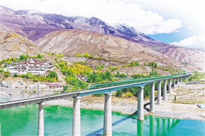 復(fù)興號列車行駛在西藏朗縣境內(nèi)(2022年4月14日攝)。新華社記者 覺果攝