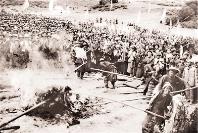 1959年8月,西藏墨竹工卡縣的翻身農(nóng)奴們興高采烈地焚燒三大領(lǐng)主的剝削文契。新華社發(fā)