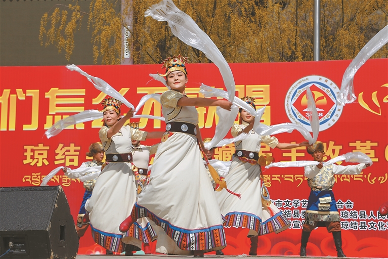 圖為3月27日,山南市瓊結(jié)縣青瓦達(dá)孜廣場(chǎng)上歡歌笑語(yǔ)、人頭攢動(dòng)。為紀(jì)念西藏民主改革67周年,一場(chǎng)以“叫我們?cè)趺床桓璩睘橹黝}的文藝演出在此舉行。圖為活動(dòng)演出現(xiàn)場(chǎng)。倫珠澤仁 記者 白瑪澤旺 攝