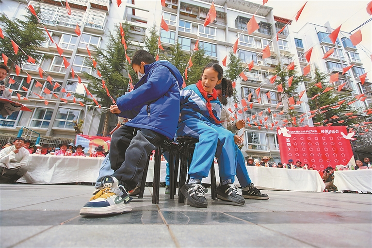 圖為3月27日下午,為紀(jì)念西藏民主改革67周年,城關(guān)區(qū)尼卓林社區(qū)黨總支在蜀園小區(qū)廣場(chǎng)舉辦“銘記歷史·感恩新時(shí)代”主題黨日暨“睦鄰茶話會(huì)”活動(dòng),眾多居民踴躍參與。圖為孩子們?cè)谶M(jìn)行搶凳子游戲。記者 王敏 攝