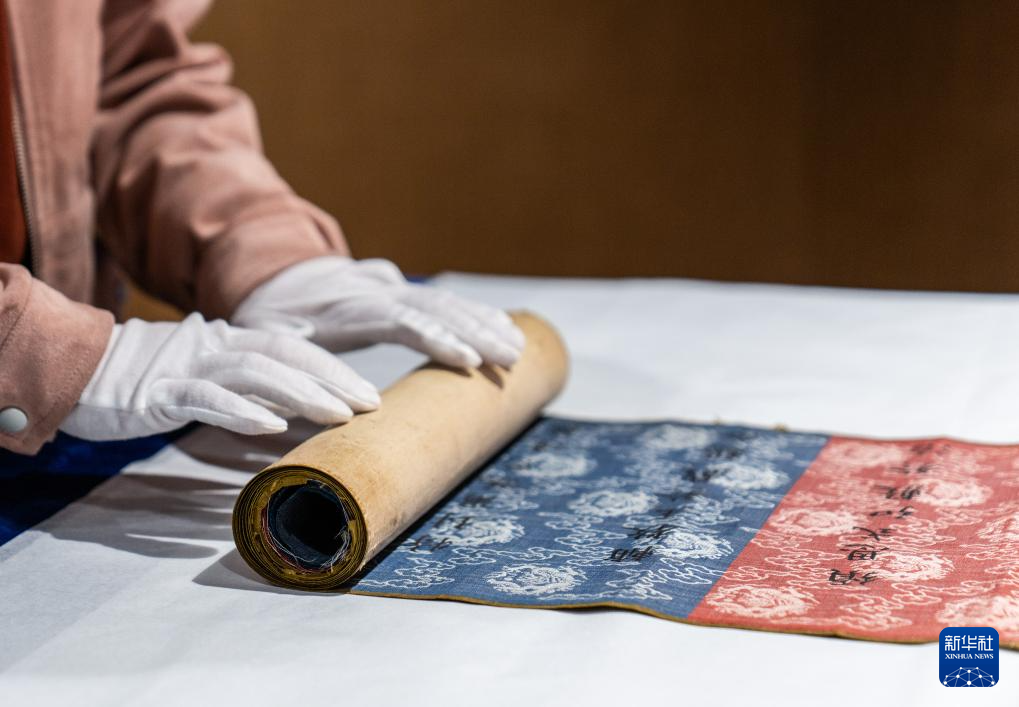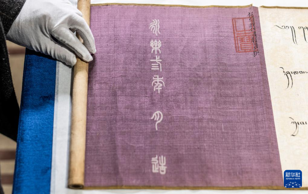 西藏博物館工作人員將《永樂十一年封斡喃渴烈思巴為輔教王誥書》徐徐展開(5月20日攝)。新華社記者 旦增尼瑪曲珠 攝 ??