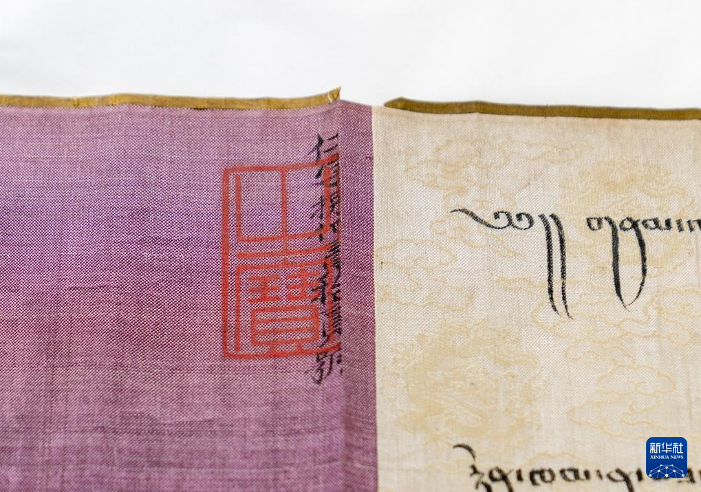 《永樂十一年封斡喃渴烈思巴為輔教王誥書》上鈐蓋有騎縫章用以防偽(5月20日攝)。新華社記者 李賀 攝 ??