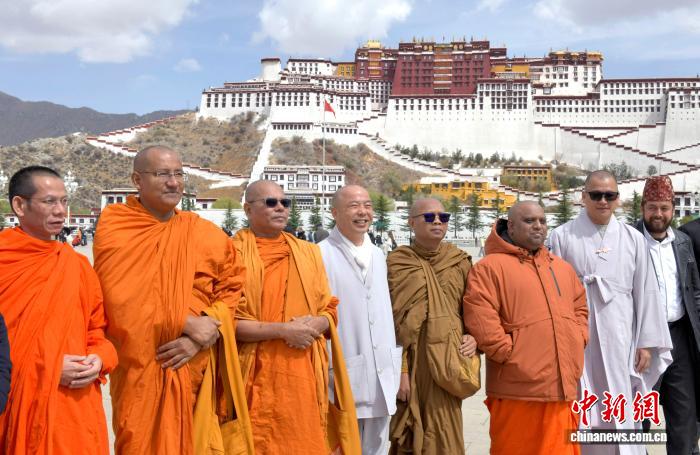 4月22日,由印度、俄羅斯、韓國、蒙古國、老撾等9個國家的宗教人士組成的19人參訪團在西藏拉薩參訪。圖為參訪團在布達拉宮廣場拍照留念。李林 攝