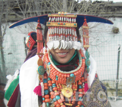 第二種在常規(guī)穿戴時是作為項圈的。金、銀質材共同構成的方形裝飾物是項圈的主要構成要素,一般外圍為銀,中間部分為金,在外圍銀質部分的四角以及金質部分的中間各鑲嵌一塊綠松石。一個項圈上共有三塊此類方形裝飾物,從中間向兩邊,分布協(xié)調。其他部分以珊瑚珠鑲嵌,并以綠松石為點綴。珊瑚珠的排列密度與珠體大小有關,一般以7—9行者居多。項圈看上去色澤艷麗且顯高貴。那么,項圈怎么又會成為頭飾的呢?原來,在某些特殊場合,尤其是非正式場合下,人們有時便會把項飾取下,“換一種感覺”,把它作為一種休閑“帽子”固定于額頭上。這也體現(xiàn)了普蘭人民在服飾文化方面的創(chuàng)造性。