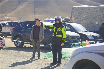 每年的物交會(huì)都會(huì)有一群節(jié)日期間依然堅(jiān)守在崗位上、為物交會(huì)順利進(jìn)行保駕護(hù)航的工作人員。 圖為交警在指揮車輛有序停放。馬靜 李利改 攝