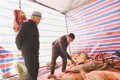 寒冬時(shí)節(jié),牛羊肉也是老百姓必備之物。在隆子縣熱榮鄉(xiāng)牦牛銷售點(diǎn),小小的帳篷里掛滿了牦牛肉,十來(lái)個(gè)顧客一邊扯著牛腿翻看著,一邊在討價(jià)還價(jià)。
