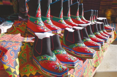 黑色氆氌藏靴是當(dāng)?shù)厝罕姸绽锎┑男?,不僅結(jié)實(shí)美觀還很保暖,很受群眾歡迎。巴桑旺姆 攝