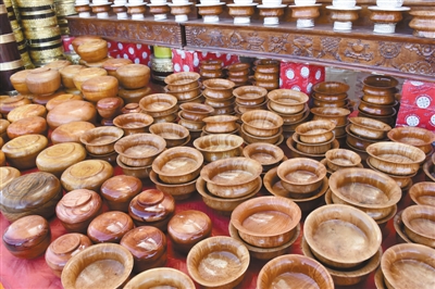 來(lái)自阿里地區(qū)普蘭縣的次仁帶著自家的木碗,早早地?cái)[好攤位,等待顧客購(gòu)買。馬靜 攝