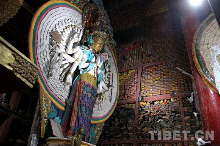 除了雄偉的建筑之外,類烏齊寺歷來(lái)以珍藏眾多的佛教經(jīng)典、佛像、唐卡而聞名于世。寺院至今珍藏著珍貴的文物精品,如不同時(shí)期的佛教經(jīng)典、雕刻精美的經(jīng)板、金銅造像、唐卡等,是一座名副其實(shí)的藏傳佛教文化寶庫(kù)。類烏齊寺所藏經(jīng)書(shū)有8萬(wàn)余冊(cè),大都用黃金、紫金、白銀、朱砂等作為原料書(shū)寫(xiě),查杰瑪大殿一層“花殿”四周為存放經(jīng)書(shū)的巨形“經(jīng)墻”。圖為經(jīng)墻一隅 攝影:李元梅