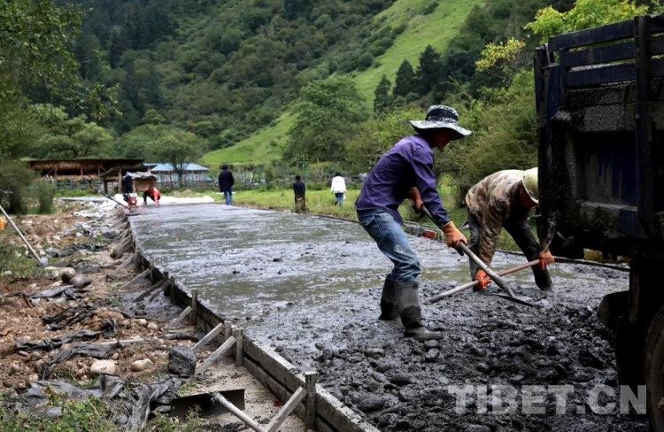 離桑巴亞中原始森林越來越近,看到工人們正在修水泥路,這條路通向村里四朗倫珠、來玉措姆這兩戶最靠近山腳的人家。