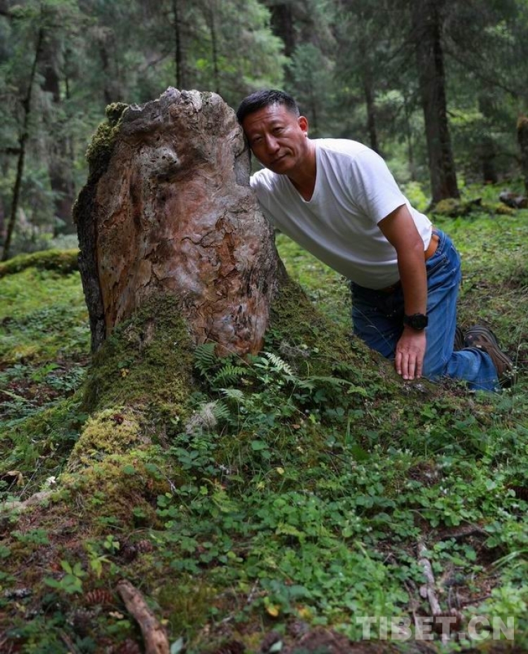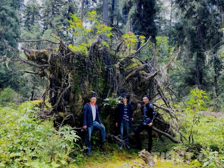 圖為作者一行在一棵于2018年被大風(fēng)吹倒的大樹留下的樹樁下合影