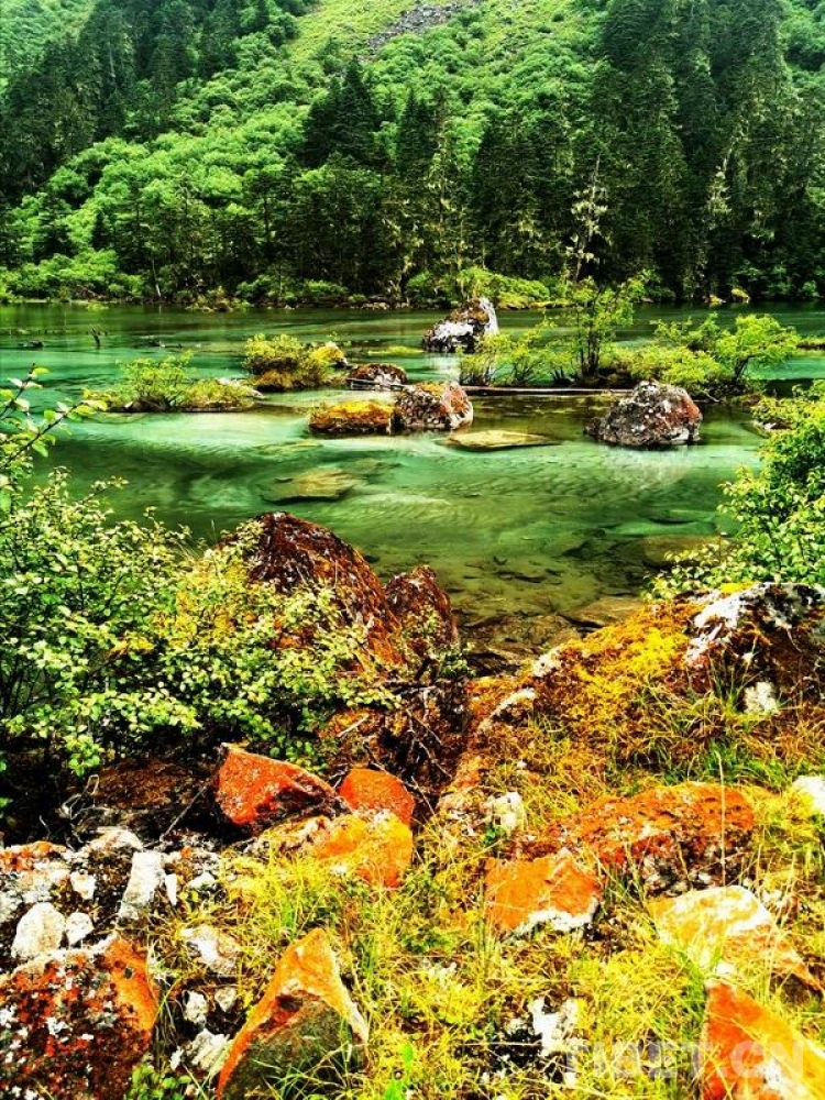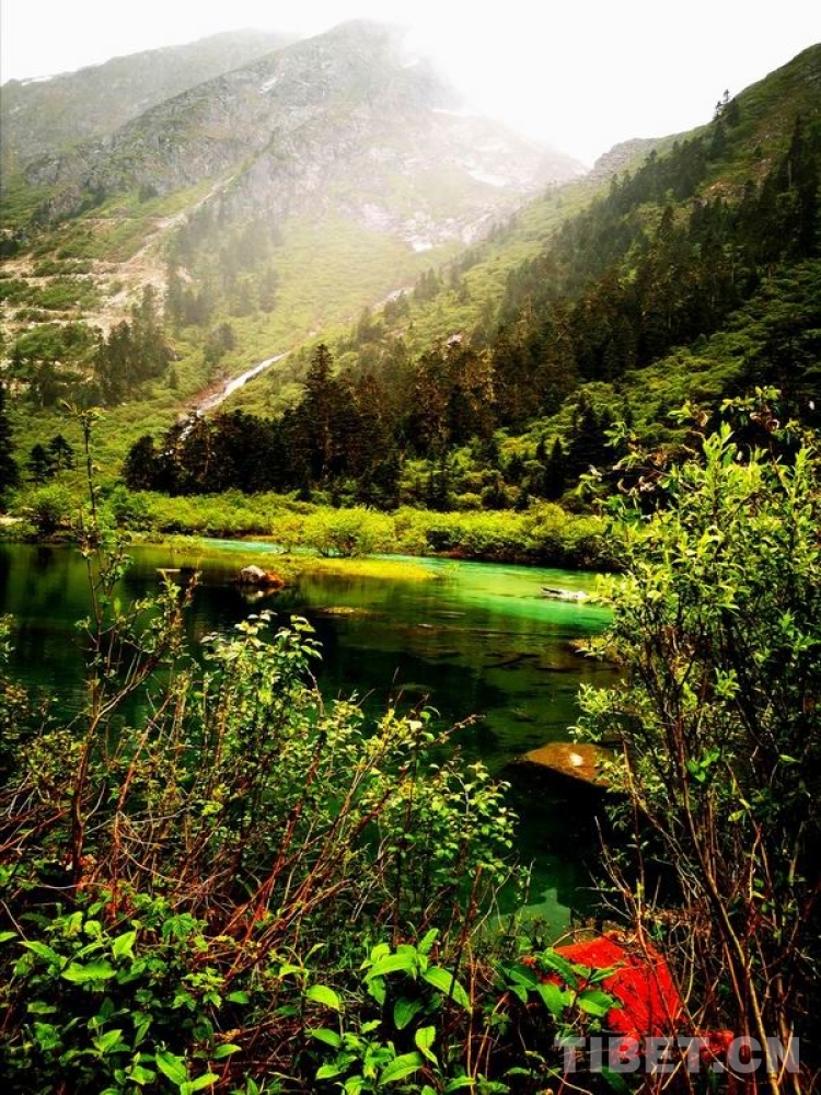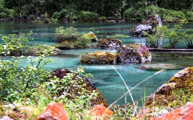 少女般的冰湖,藏于青山綠樹中,伏于深林密草內(nèi),異常迷人。站在不同的視角看冰湖,同一水域,卻有不同的顏色,綠中透著藍,藍中泛著橙、橙中映著赤、赤中蘊著黃,斑斕奪目,攝人心魄。湖水周圍的花草樹木長得異常茂盛,五光十色的倒影使湖水更加瑰麗。