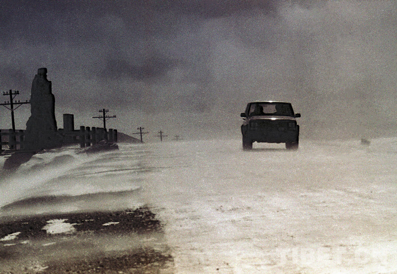 這是一輛汽車正在通過(guò)風(fēng)雪彌漫的青藏公路最高處唐古拉山口(唐召明1991年冬攝)