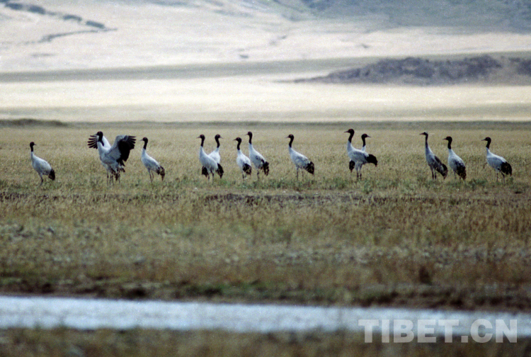 這是在藏北高原申扎縣濕地棲息的國(guó)家一級(jí)保護(hù)動(dòng)物黑頸鶴(唐召明2001年攝)