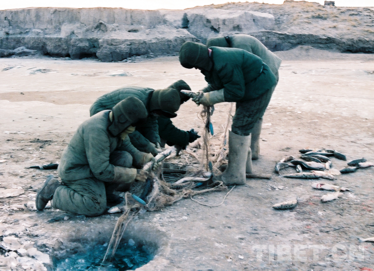這是冬季在藏北無(wú)人區(qū)扎加藏布的破冰打魚(yú)人(唐召明1990年初攝)