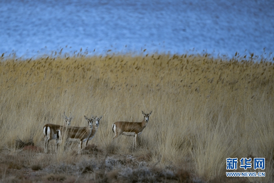 四只鵝喉羚在都蘭湖國(guó)家濕地公園內(nèi)活動(dòng)。(11月21日攝)新華網(wǎng) 潘彬彬攝