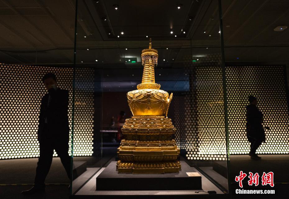 12月16日,“妙寶莊嚴——故宮博物院藏法器展”在北京嘉德藝術(shù)中心開展。113件從北京故宮博物院藏宮廷法器中精選出的展品首次大規(guī)模出宮展出。圖為“乾隆款銅鍍金嵌松石佛塔”展品。中新社記者 侯宇 攝