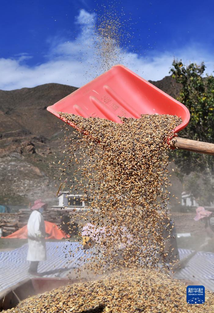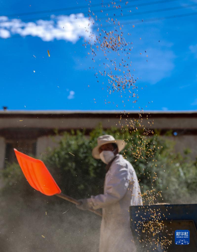 9月21日,拉薩市林周縣江熱夏鄉(xiāng)江夏村的村民在揚場。新華社記者 姜帆 攝