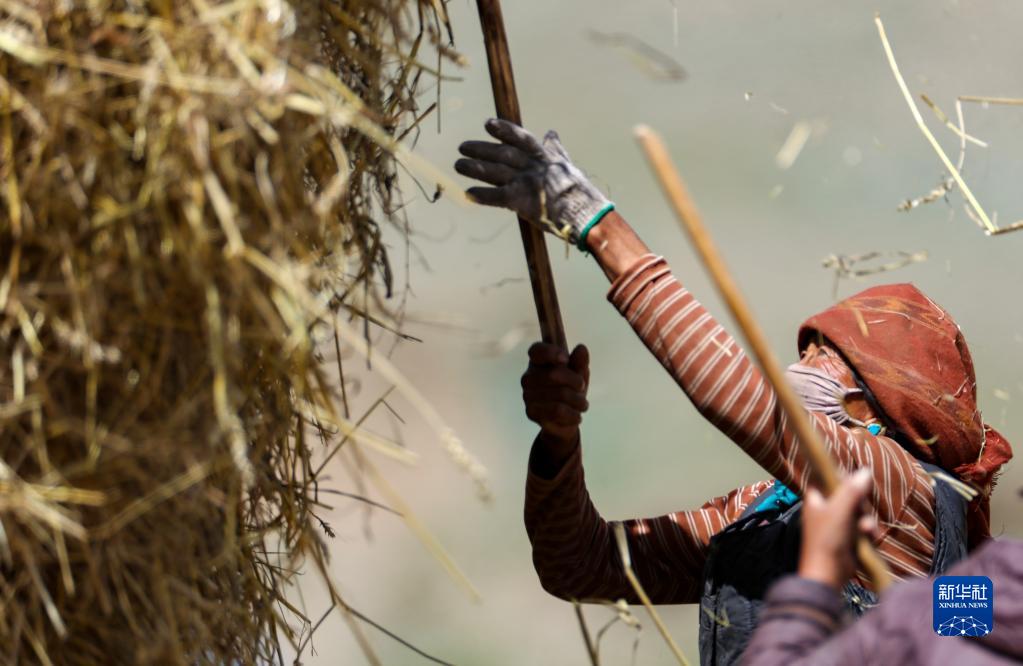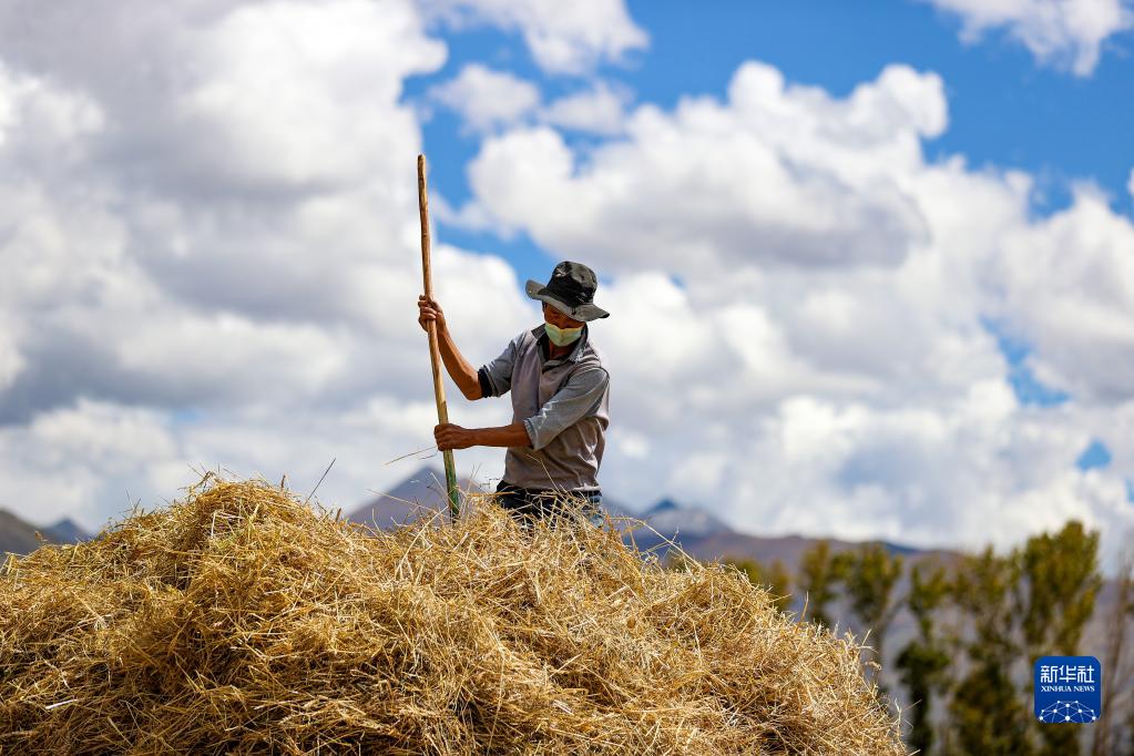 9月21日,拉薩市林周縣邊林鄉(xiāng)當杰村的村民在收集秸稈。新華社記者 覺果 攝