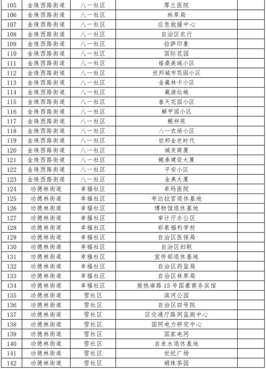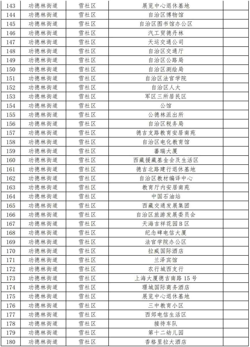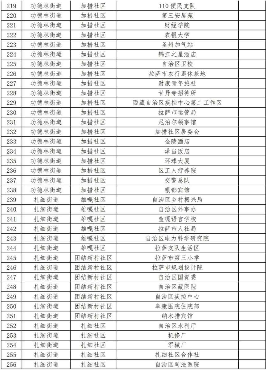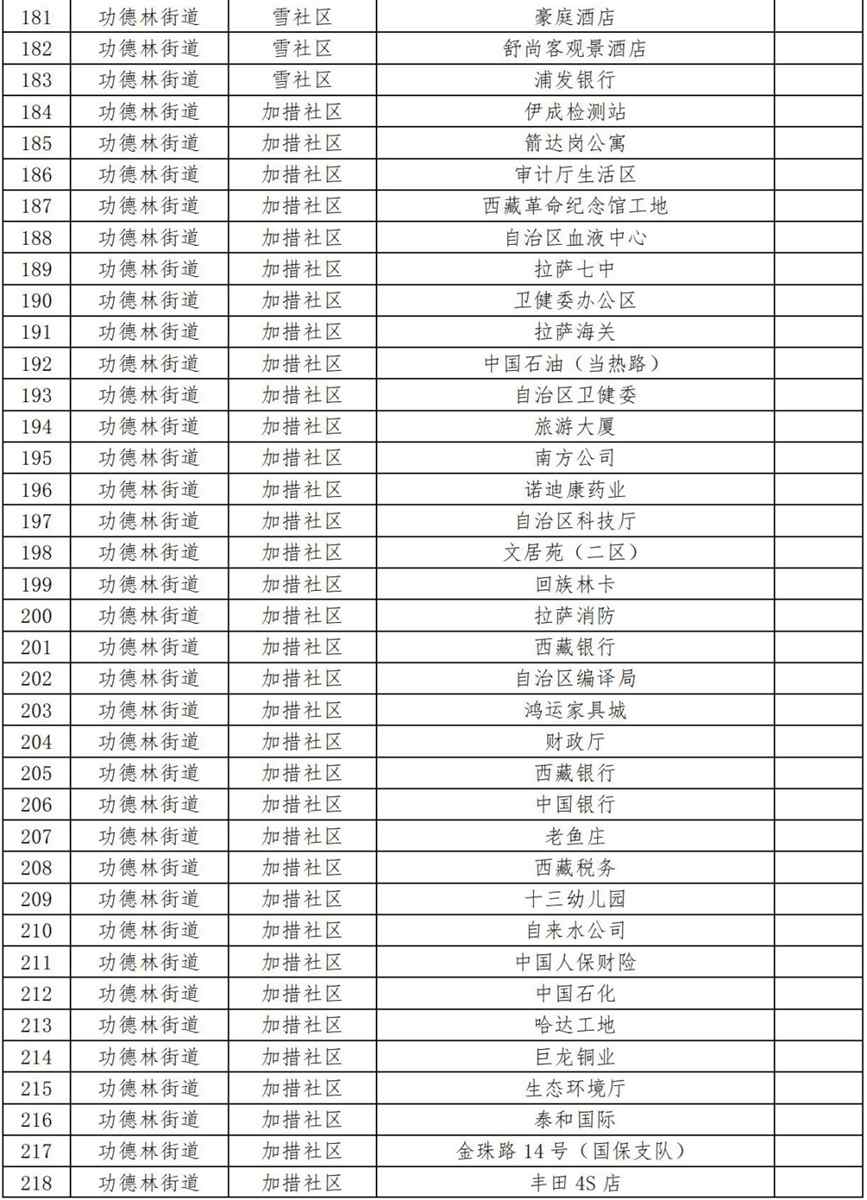 17.功德林街道加措社區(qū)(伊成檢測(cè)站、箭達(dá)崗公寓、審計(jì)廳生活區(qū)、西藏革命紀(jì)念館工地、自治區(qū)血液中心、拉薩七中、衛(wèi)健委辦公區(qū)、拉薩海關(guān)、中國石油(當(dāng)熱路)、自治區(qū)衛(wèi)健委、旅游大廈、南方公司、諾迪康藥業(yè)、自治區(qū)科技廳、文居苑(二區(qū))、回族林卡、拉薩消防、西藏銀行、自治區(qū)編譯局、鴻運(yùn)家具城、財(cái)政廳、西藏銀行、中國銀行、老魚莊、西藏稅務(wù)、十三幼兒園、自來水公司、中國人保財(cái)險(xiǎn)、中國石化、哈達(dá)工地、巨龍銅業(yè)、生態(tài)環(huán)境廳、泰和國際、金珠路14號(hào)(國保支隊(duì))、豐田4S店、110便民支隊(duì)、第三安居苑、財(cái)經(jīng)學(xué)院、農(nóng)銀大學(xué)、圣州加氣站、錦江之星酒店、自治區(qū)衛(wèi)校、拉薩市農(nóng)行退休基地、財(cái)康青年旅社、甘丹寺招待所、西藏自治區(qū)疾控中心第二工作區(qū)、拉薩市運(yùn)管局、尼泊爾領(lǐng)事館、加措社區(qū)居委會(huì)、金陵酒店、澤當(dāng)飯店、環(huán)球大廈、區(qū)工人療養(yǎng)院、交警總隊(duì)、銀都賓館);