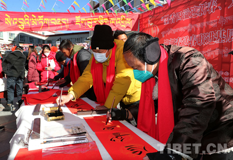 “看到藏漢對聯(lián),感覺到新年馬上要到了,祝大家新年快樂、扎西德勒。”市民次仁羅布高興地說。一個個飽含真情的“福”字和一副副紅紅火火的春聯(lián)承載著濃濃的新年祝福?;顒蝇F(xiàn)場,很多市民小心翼翼地接過墨跡未干的對聯(lián),愛不釋手地吹了又吹,臉上洋溢著幸福的笑容。