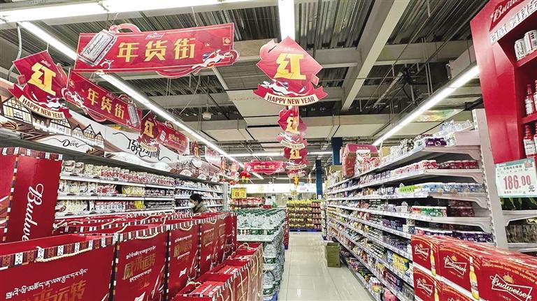 新年到,購(gòu)買(mǎi)年貨不可少。走進(jìn)大麥超市,寫(xiě)有“新年快樂(lè)”字樣的標(biāo)語(yǔ)牌隨處可見(jiàn),一副副寓意吉祥的對(duì)聯(lián)、各式各樣的“?!弊?、燈籠等新年裝飾,把春節(jié)的氣氛烘托得喜慶十足。貨架上,新鮮蔬菜、米面糧油、糖果點(diǎn)心、酒水飲料等熱銷年貨種類繁多、一應(yīng)俱全,人們喜氣洋洋地穿梭在貨架旁,精心挑選著心儀的物品。市民張女士正在挑選對(duì)聯(lián),她告訴記者:“今年我們?nèi)叶荚诶_過(guò)年,想把家里好好裝飾一下,讓過(guò)年的氛圍更濃一些。新年要有新氣象,我希望家人平平安安、健健康康。”