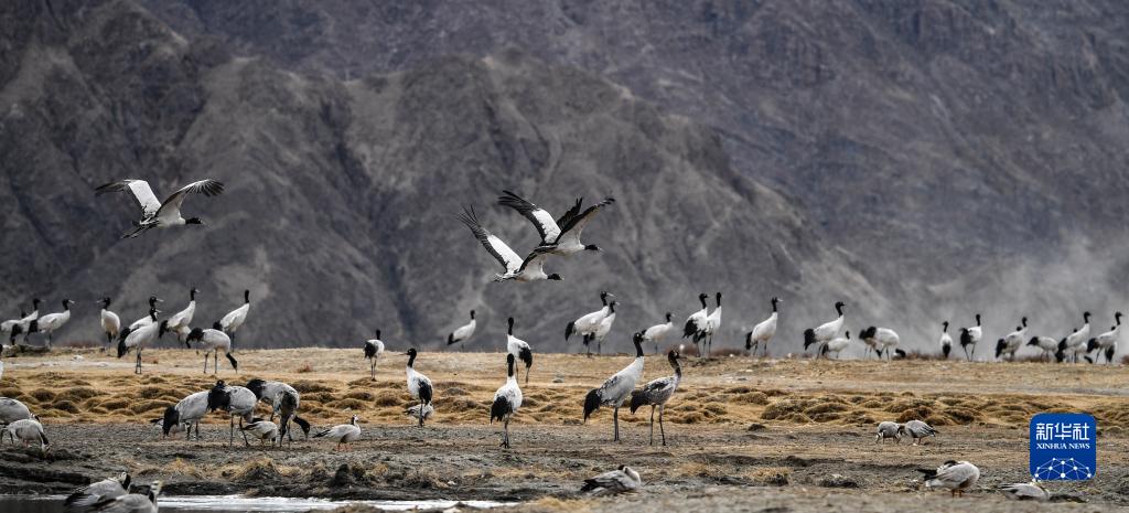 在西藏雅魯藏布江中游河谷黑頸鶴國家級自然保護(hù)區(qū)日喀則片區(qū)拉孜縣附近,大量越冬的黑頸鶴翩翩起舞,迎接春天的到來。