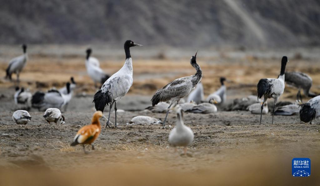 在西藏雅魯藏布江中游河谷黑頸鶴國家級自然保護(hù)區(qū)日喀則市拉孜縣越冬的黑頸鶴(1月19日攝)。新華社記者 晉美多吉 攝