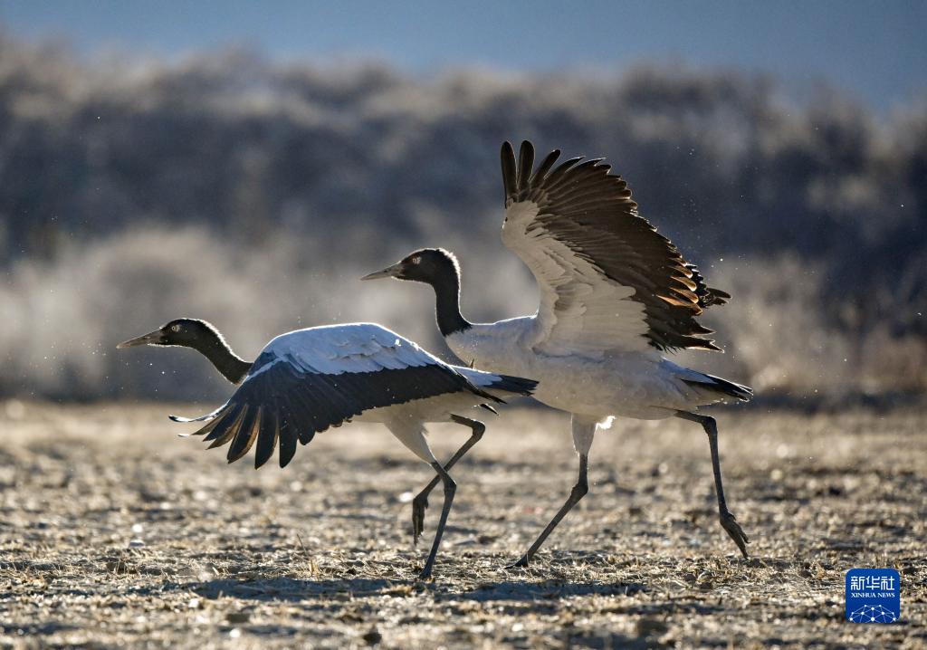 在西藏雅魯藏布江中游河谷黑頸鶴國家級自然保護(hù)區(qū)日喀則市拉孜縣越冬的黑頸鶴(1月23日攝)。新華社記者 孫非 攝