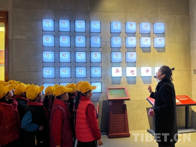 走進“藏地智慧”,學(xué)生們一眼認出藏文創(chuàng)始人吞彌·桑布扎,大家異口同聲回答講解員的問題說:“這是吞彌·桑布扎?!钡玫街v解員的肯定、并向他們講述背后的相關(guān)歷史后,學(xué)生們聽得很入迷,也更有信心面對接下來的問題。藏文的信息化使得這一古老文字煥發(fā)著全新而旺盛的生命力,在這里學(xué)生們欣賞藏文在智能手機、電腦、多功能點讀機等智能電子設(shè)備內(nèi)“走動”、傳統(tǒng)農(nóng)牧業(yè)的模擬場景和現(xiàn)代化的機械設(shè)備圖、藏醫(yī)藥材、藏香藏紙制造和制鹽過程等獨具特色的藏族傳統(tǒng)手工藝,也能很好的回答講解員提出的問題,現(xiàn)場互動氣氛熱烈?!斑@種活動我們學(xué)校不會常有,當(dāng)孩子們聽到要去拉薩時像是要過年那樣高興,一路上問這問那地充滿好奇?!倍喟奏l(xiāng)小學(xué)的帶隊老師羅珍介紹:“這次參加活動的這些學(xué)生都是三、四、五年級的學(xué)生,個個品學(xué)兼優(yōu)。”