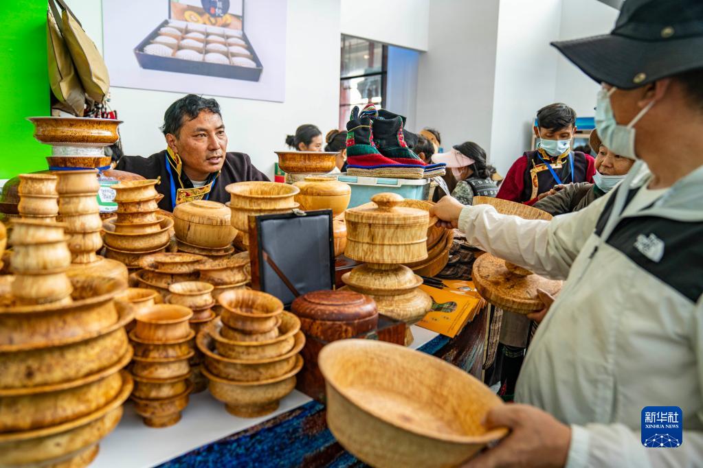 6月17日,工作人員在第五屆藏博會(huì)現(xiàn)場(chǎng)為顧客介紹木碗產(chǎn)品。新華社記者 孫非 攝