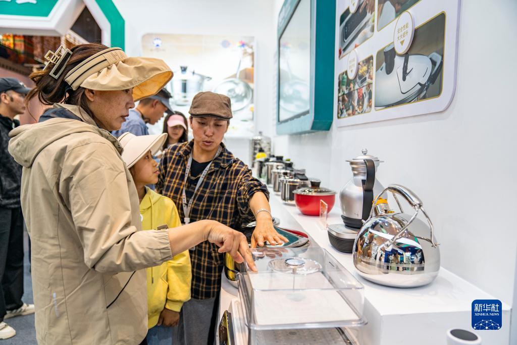 6月17日,工作人員在第五屆藏博會(huì)現(xiàn)場(chǎng)為參觀者介紹產(chǎn)品。新華社記者 孫非 攝
