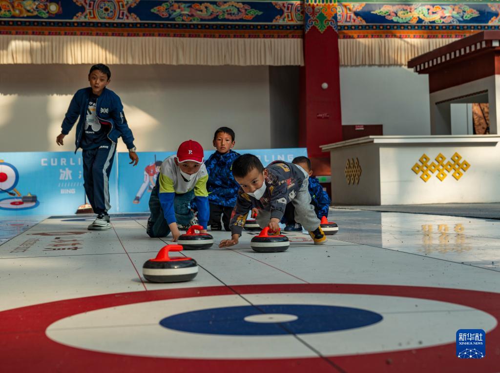 6月17日,幾名孩子在第五屆藏博會(huì)現(xiàn)場(chǎng)體驗(yàn)冰壺。新華社記者 張汝鋒 攝