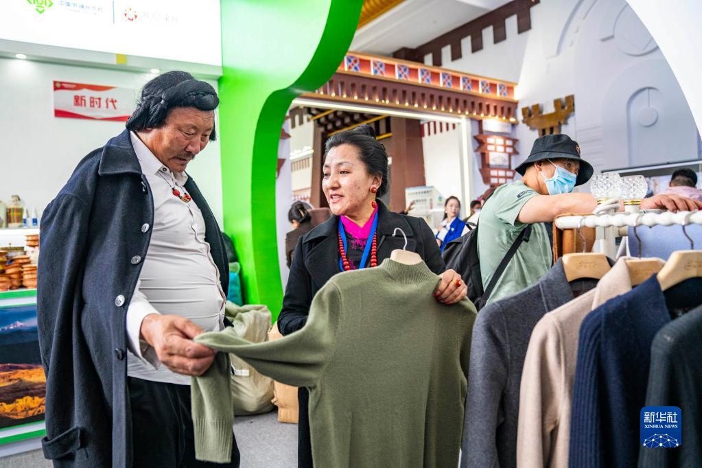 6月17日,工作人員在第五屆藏博會(huì)現(xiàn)場(chǎng)向顧客介紹產(chǎn)自阿里地區(qū)的羊絨衫產(chǎn)品。新華社記者 孫非 攝