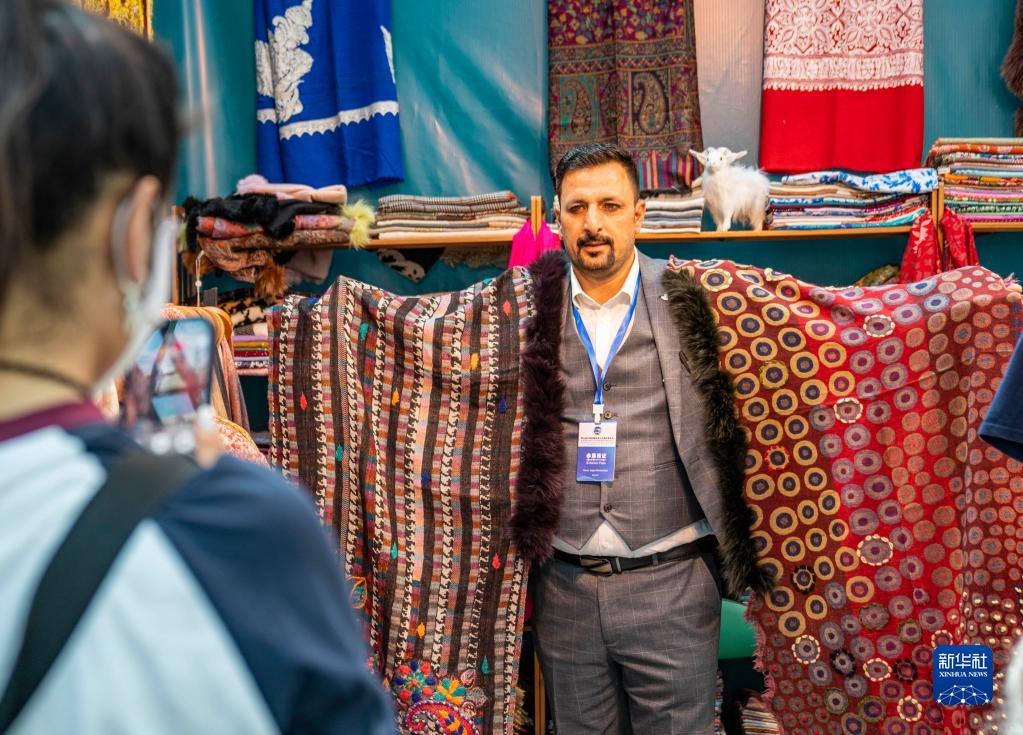 6月17日,來自印度的參展商在第五屆藏博會(huì)現(xiàn)場(chǎng)向顧客展示披肩。新華社記者 孫非 攝