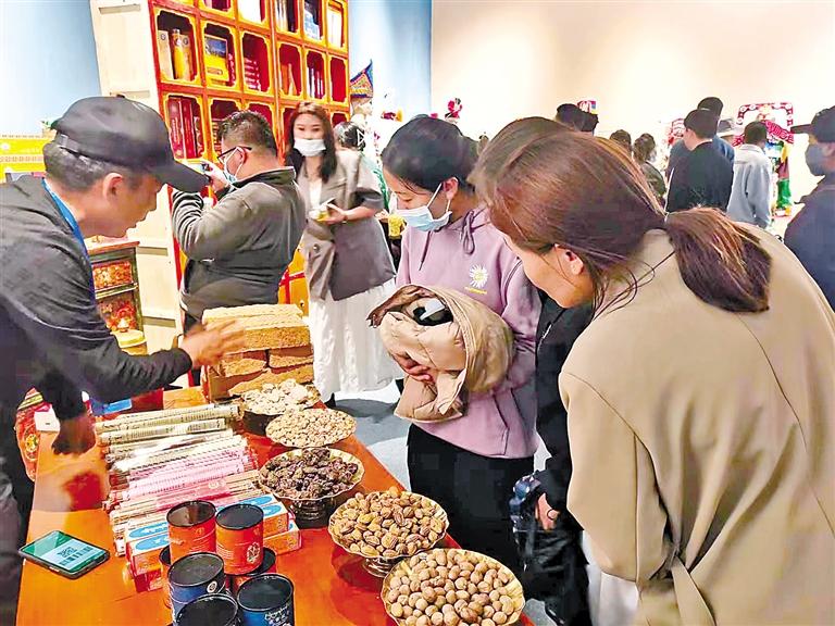 步入2號館西藏特色展區(qū)之山南市形象館,身著山南服飾的講解員、充滿山南特色的各類農(nóng)產(chǎn)品,來往的人絡繹不絕,或駐足品嘗黑青稞糌粑、或與參展商留下聯(lián)絡方式?!拔覀儊碜陨侥鲜新逶h,今天帶了卡墊、奶渣、辣椒等13種產(chǎn)品,通過藏博會這么好的平臺,把家鄉(xiāng)的特色產(chǎn)品推銷出去、宣傳出去,我感到非常欣喜。”來自山南市的參展商索南旦增說。