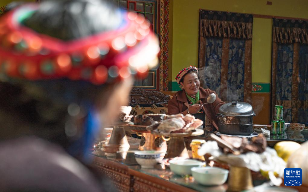 1月12日,巴桑普尺的女兒次仁普尺(左一)為家人獻(xiàn)上寓意五谷豐登的“切瑪”。新華社發(fā)(丁增尼達(dá) 攝) ??