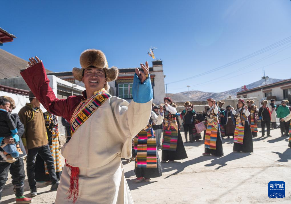思古龍村的村民們?cè)谔伹f舞(1月13日攝)。新華社發(fā)(丁增尼達(dá) 攝) ??